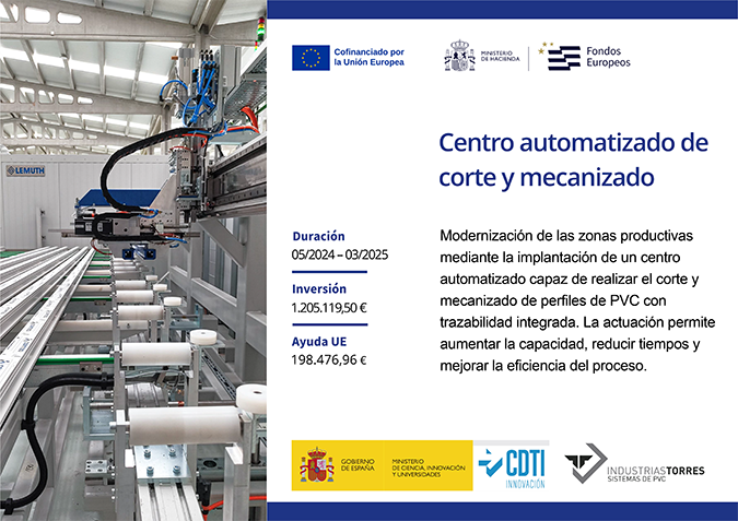 El Centro para el Desarrollo Tecnológico y la Innovación (CDTI) ha otorgado a INDUSTRIAS TORRES GOLAN, S.L. una ayuda parcialmente reembolsable dentro de la Línea Directa de Expansión (LICA) para su proyecto «Desarrollo e implementación de líneas automatizadas en las zonas productivas de puertas y ventanas de PVC».