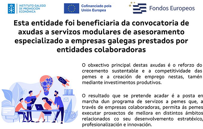 Este proyecto ha sido posible gracias al apoyo del Instituto Galego de Promoción Económica (IGAPE) mediante una ayuda a proyectos de inversión cofinanciada por la Unión Europea con el objetivo de reforzar el crecimiento sostenible y la competitividad de las Pymes así como la creación de empleo en éstas y también mediante inversiones productivas.